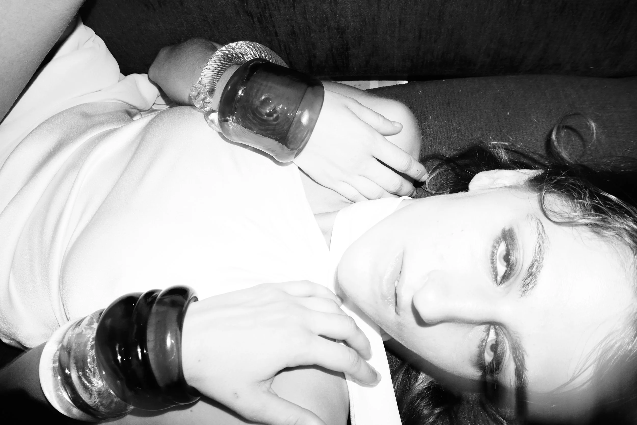 GIRLS IN GLASS #1 Isabella Velez wears two clear ROMAN shattered cuff and two clear OPTICAL cuffs with Flame worked earrings, dress & photos by Ellison Baus Brooklyn 2024